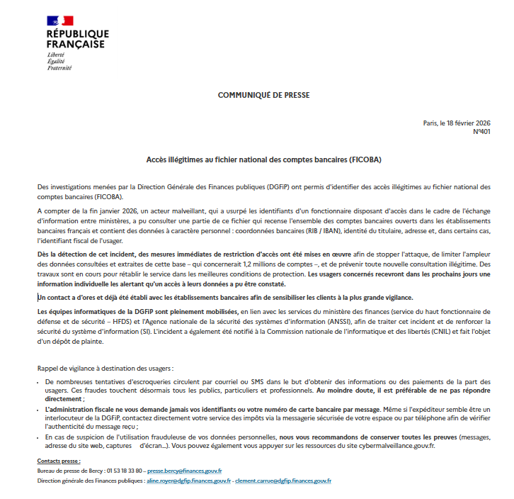 Fin janvier 2026, la Direction générale des finances publiques (DGFIP) a été victime d’une cyberattaque visant le fichier national des comptes bancaires, plus connu sous le nom de FICOBA. Ce fichier, stratégique pour l’État, recense l’ensemble des comptes bancaires ouverts en France.